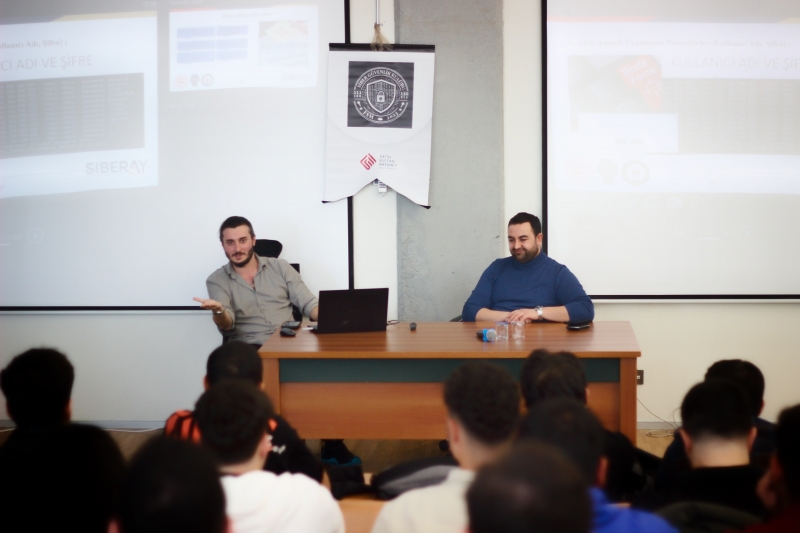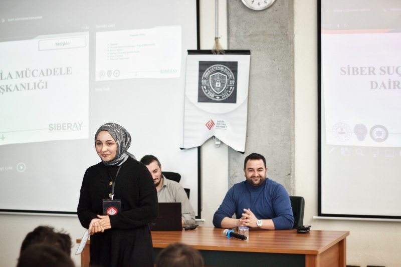Bu kapsamda, Siber Suçlarla Mücadele Daire Başkanlığı Bilişim Hukukçusu Sayın Tuncay Gündüz ve Siber Güvenlik Uzmanı Sayın Ömer Yerlikaya, siber dünyadaki tehlikeler, güvenli internet kullanımı, yaygın saldırı teknikleri ve savunma yöntemleri hakkında yaşanmış olaylara dayalı kapsamlı bilgiler sundular. Aynı zamanda siber olayların hukuki boyutları, suç unsurları ve uygulanabilecek yaptırımlar gibi kritik konulara da değinerek öğrencilerde üst düzey farkındalık oluşmasını sağladılar.